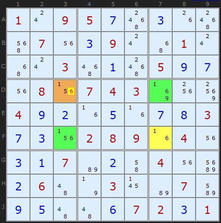 khả năng số 6 ở D3 bị bao chứa ở các khả năng còn lại nên sự tồn tại của nó là không cần thiết, trừ khi sudoku có 2 đáp án